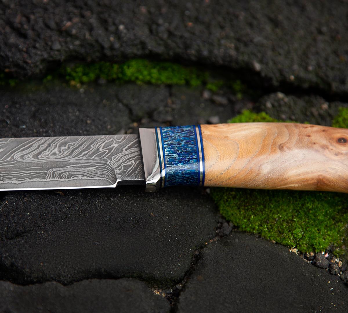 Нож Сибиряк из ламинированной стали, рукоять - стабилизированный кап клёна, вставка - позвоночник кита, формованный чехол идет в комплекте.